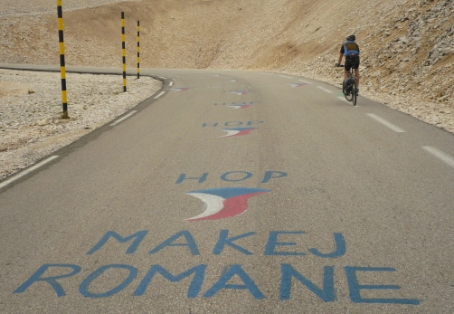 Posledních 6 km stoupání je silnice popsaná povzbuzujícími nápisy. Tento je určen pro našeho Romana Kreuzigera. Při stoupání snad každý trochu pocítí atmosféru „Le Tour“.