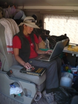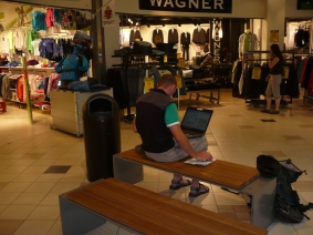 Pro představu co pro vás děláme, abychom vám poslali (skoro) nejnovější info. Vlevo Monika v improvizované "kanceláři Transit" má vždy cca 1hodinu a 50 minut a pak je nutné počítač zase nabít. Vpravo Martin v internetové kavárně "Obchodní dům".